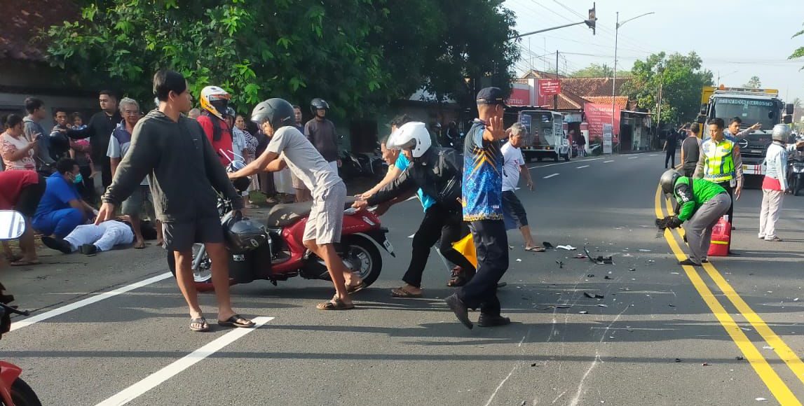 Warga yang tengah bersiap beraktivitas dikejutkan suara benturan keras dari dua sepeda motor yang saling bertabrakan di jalur utama penghubung Yogyakarta–Kulon Progo itu.