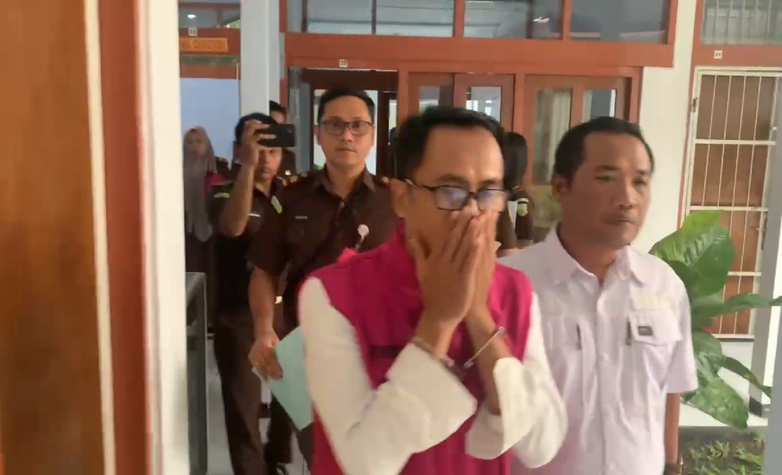 UW terlihat menitikkan air mata saat dibawa keluar dari Kantor Kejaksaan Negeri Kulon Progo untuk dibawa ke LAPAS Klas II A Yogyakarta.